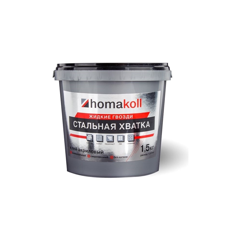 Клей Homakoll жидкие гвозди "Стальная Хватка" 1,5 кг 351581 используют внутри и снаружи помещений при ремонтно-монтажных работах. Высококачественный акриловый состав подходит для склеивания и монтажа большинства строительных, отделочных и декоративных материалов: кафельная плитка, натуральный камень, ПВХ-панели, пробка, стекло, пенополистирол, паркет, МДФ, дерево. Продукт предназначен только для впитывающих оснований: бетон, цементные и гипсовые штукатурки, влагостойкая фанера, древесина, гипсокартон, ДСтП, ЦСП, кирпич. Внимание! Избегать длительного воздействия воды на клеевой шов. Не подходит для полиэтилена, полипропилена, тефлона и т.п.