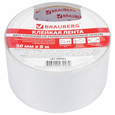 Клейкая двухсторонняя лента 50 мм х 8 м, ПОЛИПРОПИЛЕНОВАЯ ОСНОВА, 90 мкм, BRAUBERG, 600481