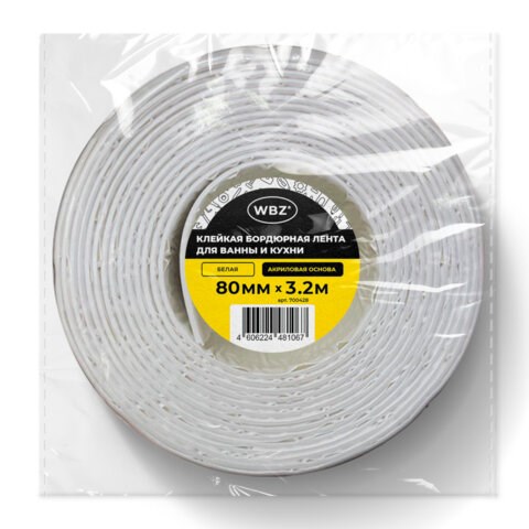 Клейкая лента бордюрная для ванны и кухни 80 мм х 3,2 м, белая, акриловая основа, WBZ (ВБЗ), 700428
