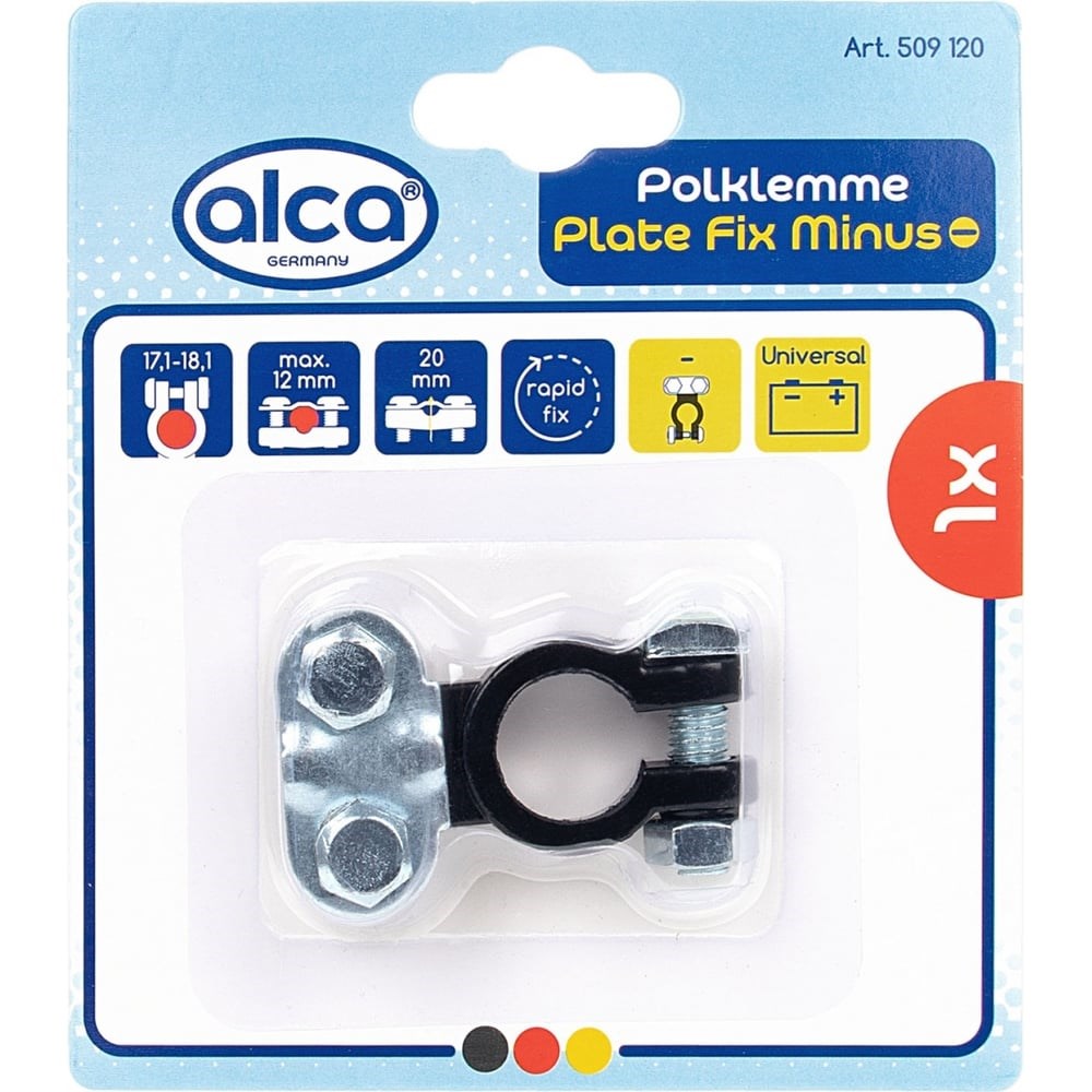 Клемма для АКБ Alca под планку свинец черная в блистере 509120 отрицательная под планку для кабеля диаметром до 12 мм и полюса размером 17,3-18,1 мм.