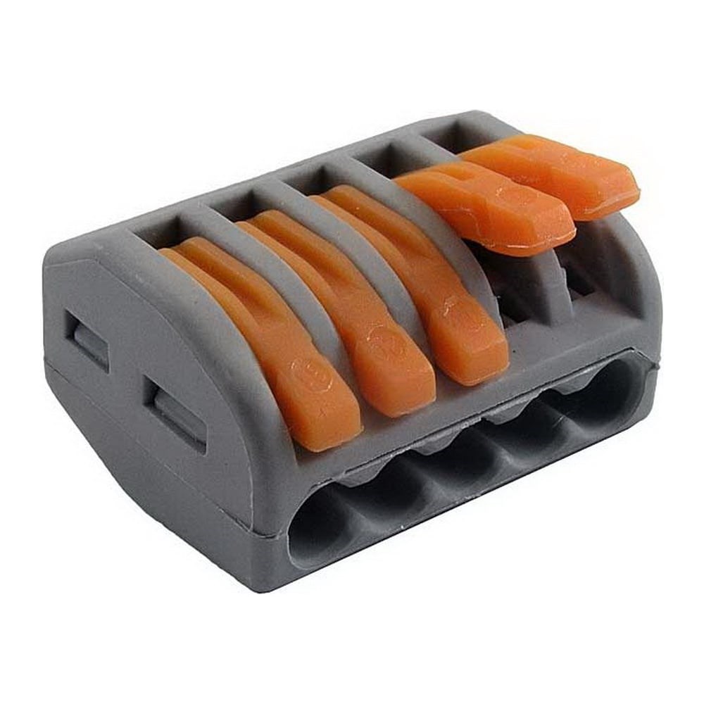 Клеммник RUICHI зажимная соединительная 5-контактная 222-415, 24 А, 250 В, PA66, упаковка 5 шт. 115410 - это навесная клеммная колодка, используемая при электромонтажных работах для соединения проводов. Соединительная клемма с рычажком 5-ти проводная, 0,08-2,5/4 кв.мм, 24А, без пасты.