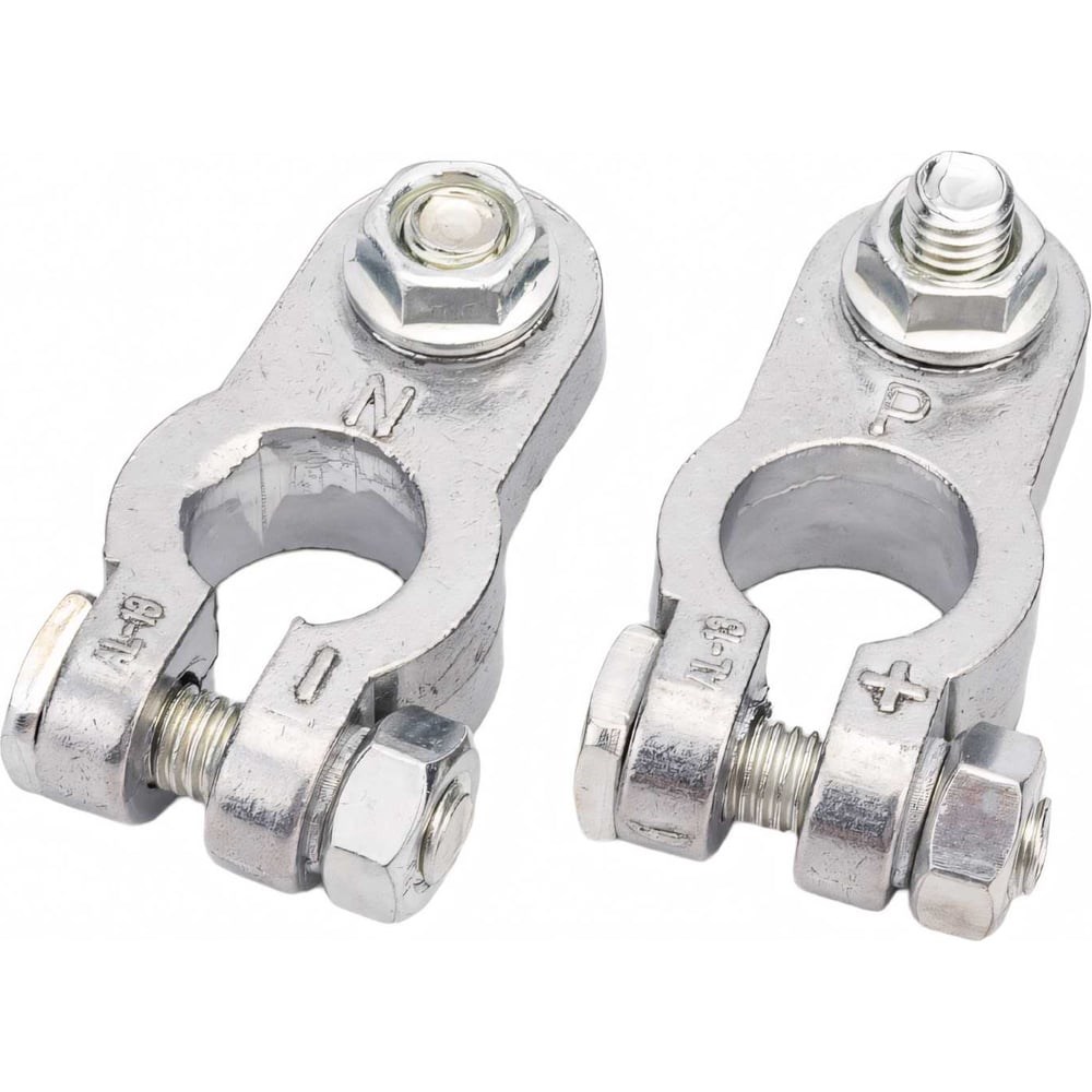 Клеммы для АКБ General Technologies комплект 2 шт. ("+" "-") в блистере. Изготовлены из алюминиевого сплава. Провод крепится болтом с гайкой. Положительная и отрицательная. Тип клемм - EURO Type 1. Тип покрытия - полирование. Крепление - под болт с гайкой М8. зажимной болт клеммы - М8