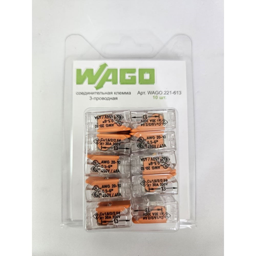 Соединительная клемма WAGO предназначена для соединения медных проводников с одной или несколькими жилами, а также с разными сечениями. Новая серия универсальных клемм 221 на 40% меньше, чем клеммы серии 222. Преимущества - высокая скорость и надежность соединения, удобство дальнейшей работы и обслуживания проводов. Проводящая часть соединителя клеммника изготовлена из меди. Специальное отверстие для тестера на обратной стороне клеммника позволяет проверить параметры соединения, не вскрывая корпус. Страна: Германия Производитель: WAGO Артикул: 221-613 Блистер-упаковка: 10 шт Тип изделия: Клемма Количество контактов: 3 Диапазон сечений: 0.5-6 Номинальный ток: 41А Номинальное напряжение: 450В Цвет: Прозрачный Диапазон рабочих температур: до +105 Напряжение: 450В Способ монтажа: На кабель Дополнительная информация: Импульсное напряжение 4 кВ
