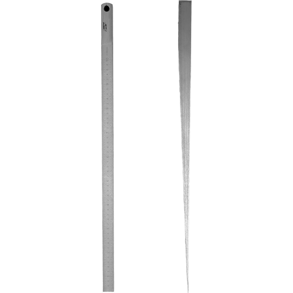 Щуп клиновой представляет собой клиновидный металлический шаблон с нанесенной лазером на его наклонной грани измерительной метрической шкалой. Каждое деление измерительной шкалы указывает толщину клина в месте нахождения штриха.Хромированная поверхность для легкого считывания результатов.Щуп изготовлен из нержавеющей стали.Допускаемая абсолютная погрешность измерений, мм - ±0,02Назначение изделия: Изделие предназначено для определения для замера ширины зазоров, стыков и других элементов. Может использоваться вместо набора щупов. Щуп особенно удобен при использовании в строительных работах. Щупом нельзя пользоваться для измерения зазора между втулками и штоками клапанов и для измерения боковых зазоров в шпоночных соединениях; эти зазоры следует определять по разности размеров гнезда и шпонки.