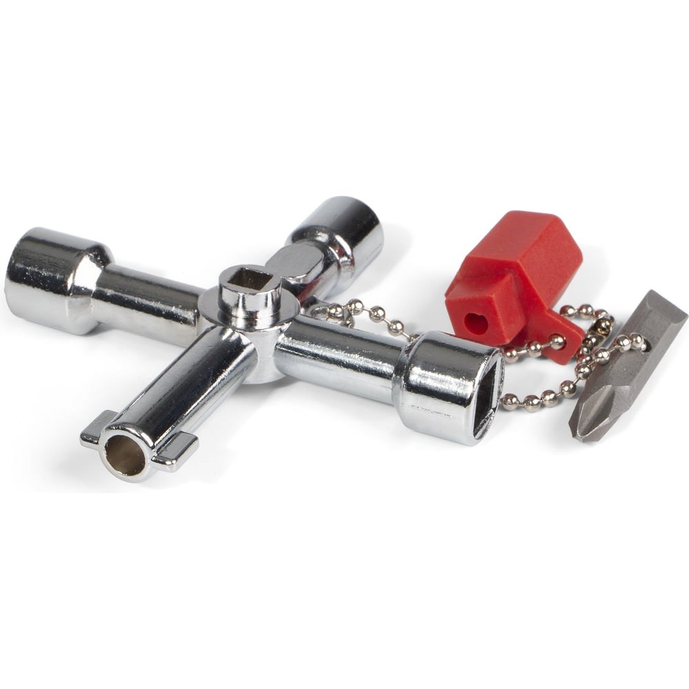 Ключ для электрошкафов КВТ КЭШ-5 78068 включает в себя пять различных профилей. Инструмент имеет небольшие размеры и простую форму - это позволяет всегда держать изделие при себе. Двухсторонняя бита закреплена на прочной цепочке. Размеры: Квадрат 5, 6, 8 мм; Треугольник 9 мм; Спец ключ 3-5 мм; Бита PH2/SL 7.