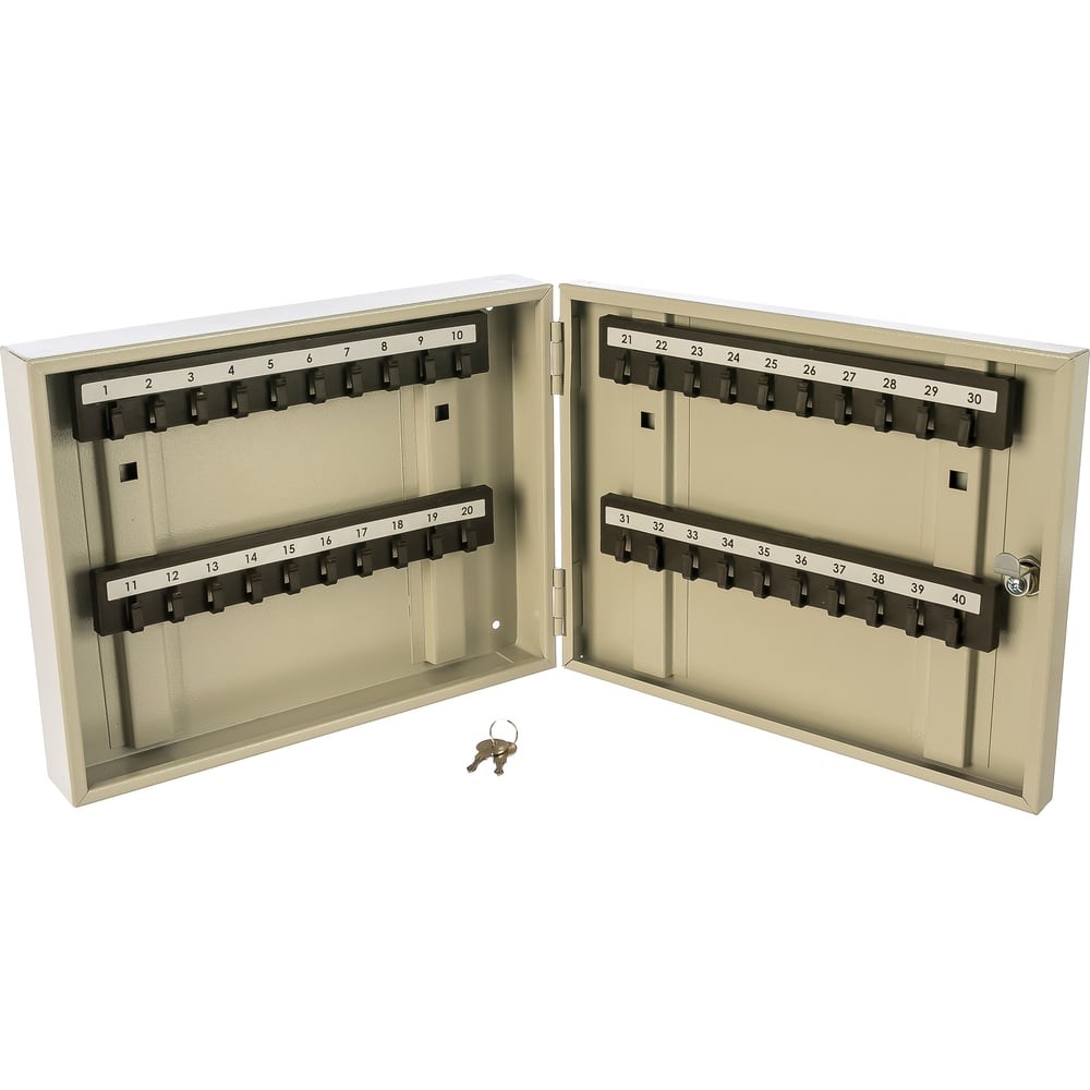Ключница + 40 брелоков МЕТКОН КЛ-40Б MT_03_002_05_Ss представляет собой металлическую конструкцию габаритами 275х350х75 мм с толщиной стенки 1 мм. Отверстия в задней стенке допускают крепление модели к стене. Есть 4 планки для навешивания 40 комплектов ключей. Вес шкафчика составляет 2.9 кг. Замок - «Cam-Lock». Светло-серый цвет ключницы не раздражает глаза пользователя и легко вписывается в интерьер офиса, общежития, гостиницы.