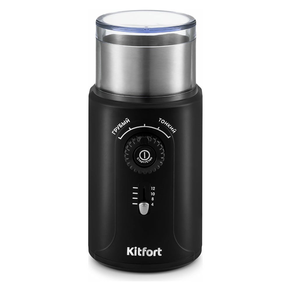 Кофемолка KITFORT КТ-747 предназначена для помола кофейных зёрен и измельчения специй и орехов. Прибор оснащён регуляторами степени помола и количества чашек. Кнопка включения расположена на регуляторе степени помола. Защитный механизм не позволит включить кофемолку, если крышка установлена неправильно. В чаше установлен двухлезвийный нож-дробилка для эффективного измельчения зёрен кофе, специй или орехов. Кофемолка укомплектована съёмной чашей из нержавеющей стали и прозрачной крышкой, а на дне есть специальные прорезиненные нескользящие ножки.