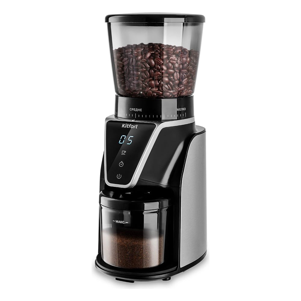 Кофемолка KITFORT КТ-784 предназначена для помола кофейных зёрен. Она имеет конические жернова из углеродистой стали. Кофемолка даёт равномерный помол и позволяет настроить его степень: от мелкого - для эспрессо кофеварки, до крупного - для френч-пресса. Отличается высокой производительностью в 165 Вт, и за 1 цикл работы способна измельчить до 100 г продукта. Даёт равномерный помол и не перегревает кофе в отличие от роторных кофемолок. Нескользящие ножки делают прибор устойчивее на поверхности. У кофемолки есть LED-дисплей и сенсорное управление, что делает устройство удобным в использовании. Дисплей показывает время работы, количество чашек до 10 порций и таймер на 40 секунд. Сверху находится регулятор, где можно настроить степень помола. Конические жернова - это два конуса, один в другом. Внешний конус неподвижный, а внутренний вращается. Зерно, между жерновами, перемалывается, продвигаясь вниз. Такие жернова позволяют перемалывать зёрна за короткий промежуток времени, не перегревая их. Контейнеры для молотого кофе и для зёрен съёмные. Внешний жернов также съёмный - для удобства очистки. Для чистки жерновов используется щёточка, которая идёт в комплекте с кофемолкой.