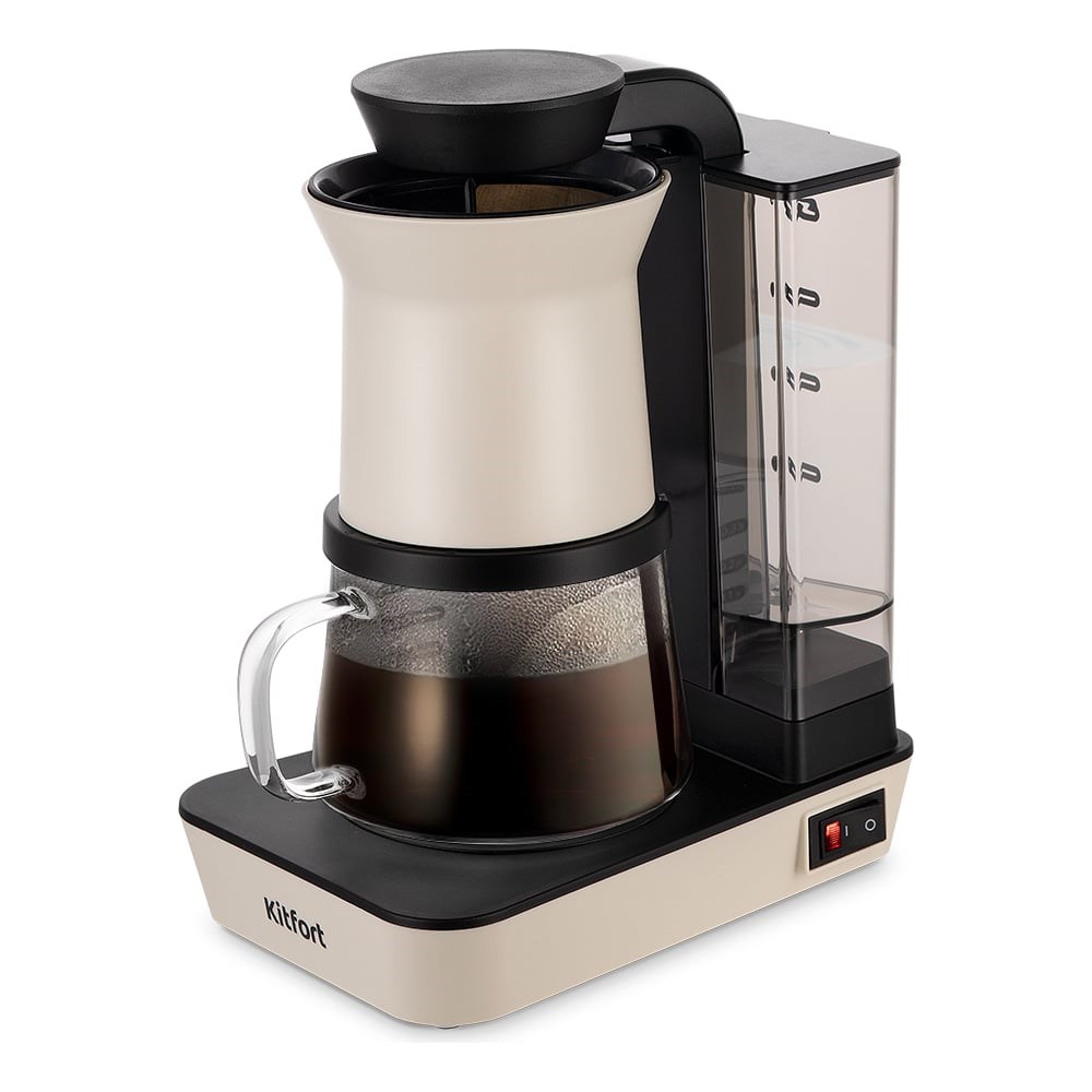 Капельная кофеварка КТ-7190 готовит ароматный черный кофе из молотого кофе. Кофеварка отличается компактностью и поместится на любой кухне. При этом она позволяет быстро приготовить кофе на небольшую компанию. При приготовлении кофе вода нагревается в корпусе устройства, а затем подкачивается помпой и подается в фильтр с молотым кофе. Многоразовым фильтром можно пользоваться неограниченное количество раз. Температура воды для приготовления кофе 80 °C. Пройдя через фильтр, кофе поступает в стеклянный кофейник. В месте установки кофейника находится платформа для подогрева. По завершении приготовления кофе включается подогрев на 15–20 минут в зависимости от того, сколько чашек кофе вы приготовили за раз. Затем кофеварка автоматически отключается. Капельная кофеварка рассчитана на приготовление 1, 2, 3 или 4 чашек кофе. Многоразовый фильтр вмещает до 70 грамм молотого кофе, но рекомендуемое количество молотого кофе на 4 чашки — 28 грамм. На резервуар для воды нанесены отметки, соответствующие количеству чашек, поэтому вам будет удобно отмерить количество воды, необходимое для приготовления желаемого количества кофе. В комплекте предусмотрена мерная ложка, с помощью которой вам будет легко насыпать нужное количество кофе.