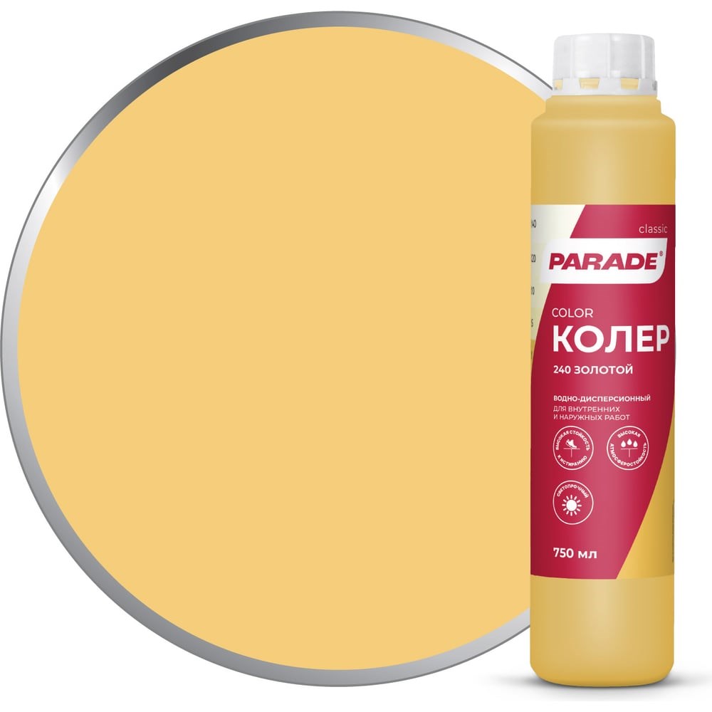 Колер PARADE №240 золотой 0,75 л Россия 90001421800 - экологически чистый колер. Предназначен для тонирования всех видов красок, шпатлевок и декоративных штукатурок на водной основе. Для внутренних и наружных работ.