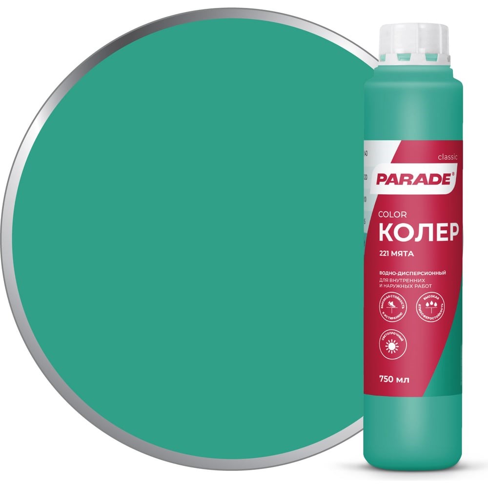Колер мятный PARADE №221 0,75 л Россия 90001421804 - экологически чистый колер. Предназначен для тонирования всех видов красок, шпатлевок и декоративных штукатурок на водной основе. Для внутренних и наружных работ.