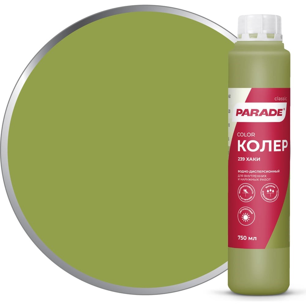 Колер PARADE №239 Хаки 0,75 л Россия 90001421810 - экологически чистый колер. Предназначен для тонирования всех видов красок, шпатлевок и декоративных штукатурок на водной основе. Для внутренних и наружных работ.