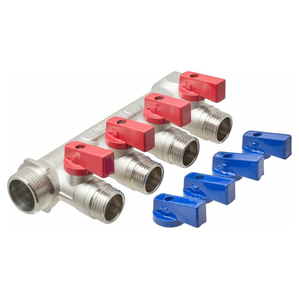 Коллектор с отсекающими кранами MPF 4 выхода х3/4" х1/2" наружная резьба ИС.071073 предназначен для распределения одного водяного потока на несколько одинаковых или не одинаковых по давлению. На двух противоположных сторонах устройства предусмотрено резьбовое соединение 3/4" (с одной стороны внутренняя резьба, с другой — наружная) для подключения к магистрали и соединения «гребёнок» между собой. На свободный конец коллектора устанавливается заглушка или дополнительный сантехнический прибор, например, мембранный гаситель гидроударов или коллекторный угольник/тройник для возможности установки воздухоотводчика, термометра, манометра выносного датчика термостата или сливного крана.На выходных отверстиях установлены шаровые краны, позволяющие открывать и закрывать водяной поток на каждой отдельной ветке. Открытие или закрытие шарового крана происходит путем поворота металлической ручки на 90 градусов.Внимание: сменные ручки вложены в корпус коллектора.