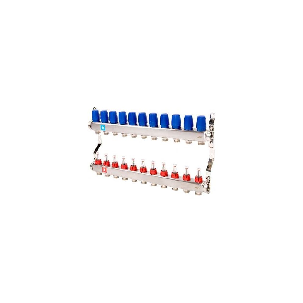 Коллектор MVI из нержавеющей стали, в сборе с расходомерами, 11 выходов MS.511.06 предназначен для распределения потока рабочей среды систем водяного отопления по потребителям. При этом под «потребителем» понимается отдельный нагревательный прибор или группа приборов, контур или петля «теплого пола», отдельные части или ветви системы. Коллекторный блок объединяет в себе подающий и обратный коллекторы из нержавеющей стали, запорные клапаны, термостатические клапаны (с возможностью установки электротермического сервопривода) и крепежные кронштейны. Присоединение циркуляционных петель осуществляется с помощью фитингов стандарта «евроконус» 3/4" (НР).