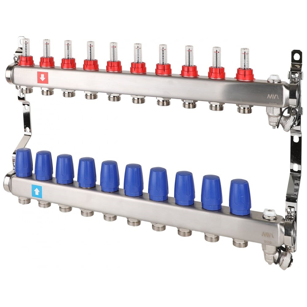 Коллектор MVI из нержавеющей стали, в сборе с расходомерами, дренажным краном и воздухоотводчиком MS.710.06 предназначен для распределения потока рабочей среды систем водяного отопления по потребителям. При этом под «потребителем» понимается отдельный нагревательный прибор или группа приборов, контур или петля «теплого пола», отдельные части или ветви системы. Коллекторный блок объединяет в себе подающий и обратный коллекторы из нержавеющей стали, запорные клапаны, термостатические клапаны (с возможностью установки электротермического сервопривода) и крепежные кронштейны. Присоединение циркуляционных петель осуществляется с помощью фитингов стандарта «евроконус» 3/4" (НР).