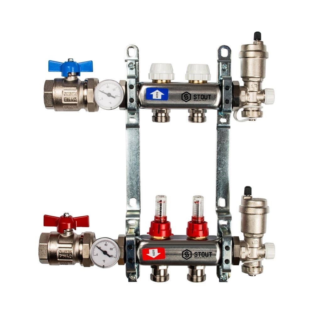 Коллектор из нержавеющей стали в сборе с расходомерами STOUT 2 выхода SMS 0907 000002 - это приспособление для подачи, распределения и регулировки потока теплоносителя. Изделие устанавливается в системы водяного отопления или теплого пола. Коллектор обладает двумя клапанами с расходомерами, которые позволяют измерять расход воды. Представляет собой надежный и долговечный элемент за счет: высокой пропускной способности; способности выдерживать давление до 10 бар; максимально выдерживаемой температуры теплоносителя до 100 °С; корпуса из нержавеющей стали; балансировочного расходомера.