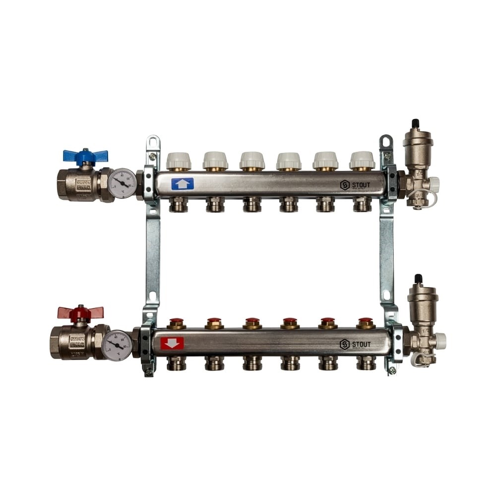 Коллектор из нержавеющей стали в сборе без расходомеров STOUT 6 выходов SMS 0912 000006 предназначен для подачи и распределения воды в системах теплого пола или в радиаторах отопления. Изделие позволяет перекрывать систему полностью с помощью шаровых кранов или отдельные узлы благодаря запорно-балансировочным клапанам (6 штук). Представляет собой надежный и долговечный элемент за счет: высокой пропускной способности; способности выдерживать давление до 10 бар; максимально выдерживаемой температуры теплоносителя до 100 °С; корпуса из нержавеющей стали.
