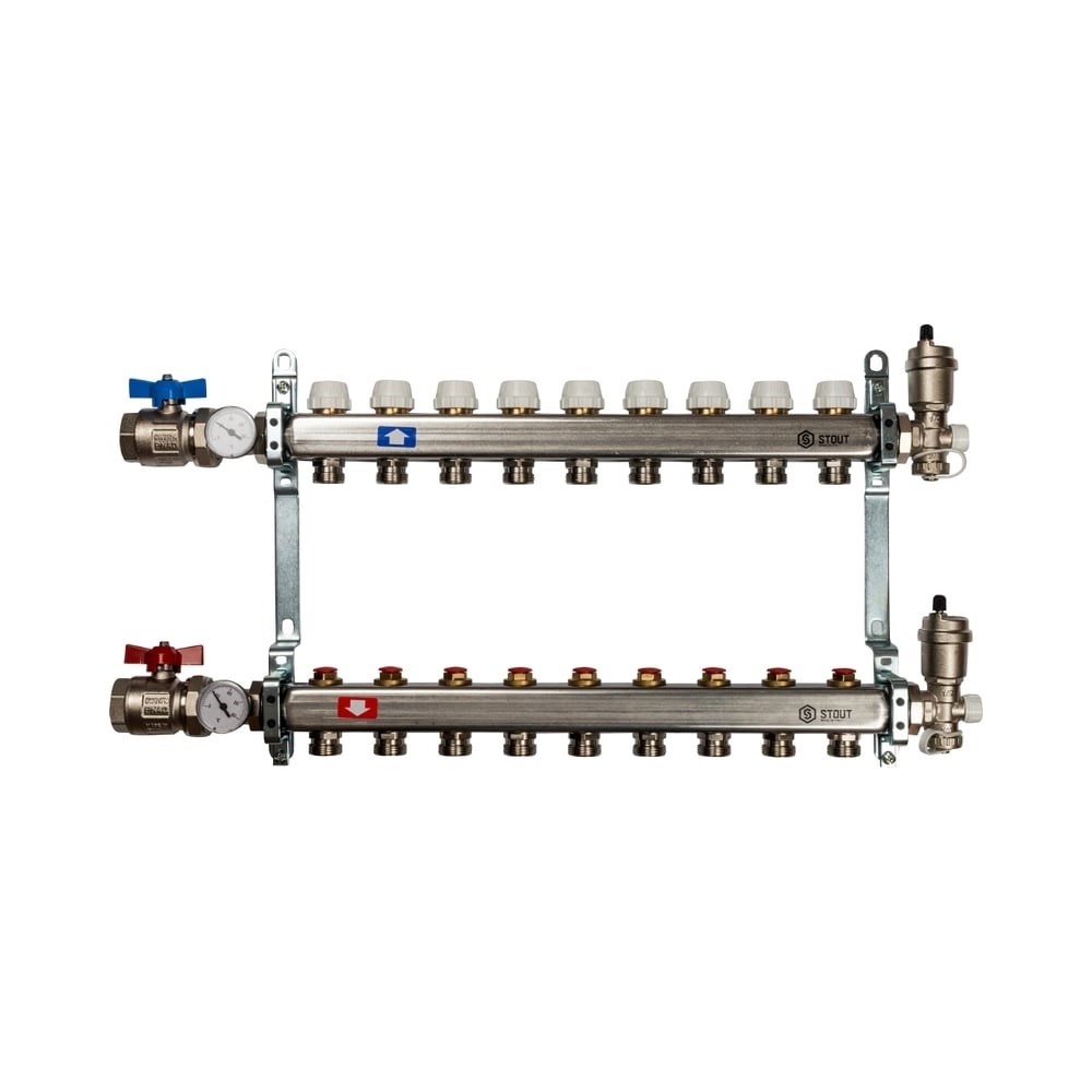 Коллектор из нержавеющей стали в сборе без расходомеров STOUT 9 выходов SMS 0912 000009 используется в зданиях с поквартирной разводкой трубопроводов. Изделие может использоваться с трубами из любых материалов. Коллектор служит для подачи и распределения теплоносителя на 9 узлов. Представляет собой надежный и долговечный элемент за счет: высокой пропускной способности; способности выдерживать давление до 10 бар; максимально выдерживаемой температуры теплоносителя до 100 °С; корпуса из нержавеющей стали.