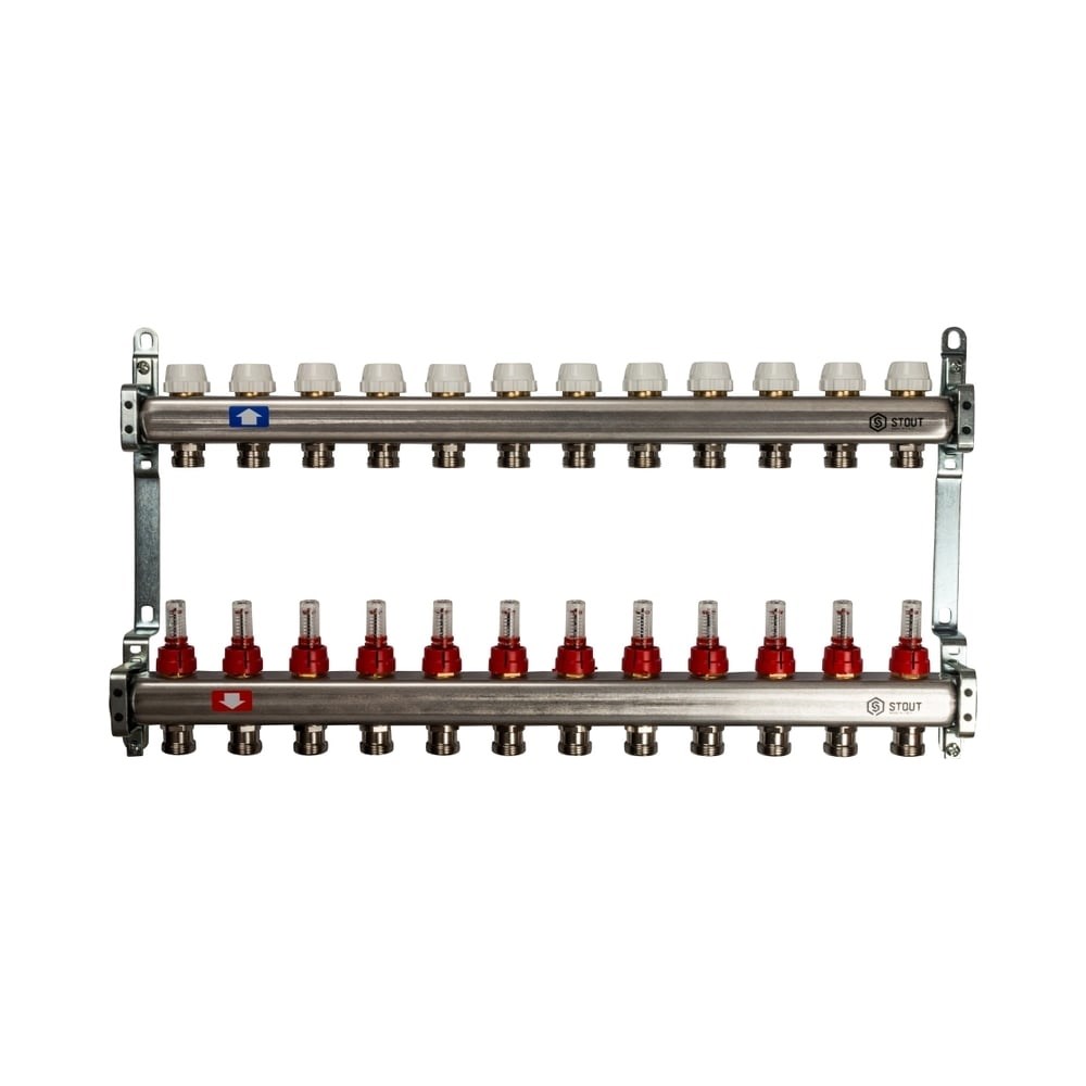 Коллектор из нержавеющей стали с расходомерами STOUT 12 выходов SMS 0917 000012 - это элемент, способный распределять теплоноситель на 12 циркуляционных колец системы радиаторного отопления или теплого пола. Изделие можно использовать в многоквартирных зданиях и домах индивидуальной застройки. Представляет собой надежный и долговечный элемент за счет: высокой пропускной способности; способности выдерживать давление до 10 бар; максимально выдерживаемой температуры теплоносителя до 100 °С; корпуса из нержавеющей стали; расходомеров, способных устанавливать температурный баланс.
