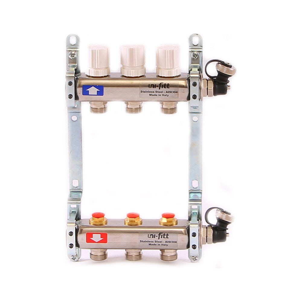 Коллекторная группа Uni-Fitt 1х3/4, 3 выхода, с регулировочными и термостатическими вентилями, нержавеющая сталь 451I4303 предназначена для распределения и регулирования потоков теплоносителя в низко- или высокотемпературных системах отопления. Оснащена балансировочными вентилями на подающем коллекторе и термостатическими вентилями (с возможностью установки термоэлектрических приводов) на обратном коллекторе.