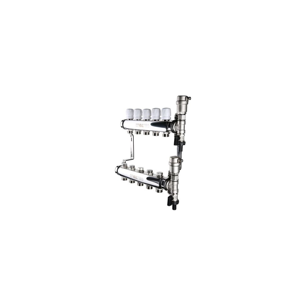 Коллекторная группа VALTEC в сборе, 1х6 вых. Евроконус 3/4 VTc.588.EMNX.0606 распределяет потоки по контурам теплого пола или иных климатических систем. Прибор оснащен клапаном для регулировки. Аппарат оборудован воздухоотводчиками с отсекающими клапанами и дренажными кранами.