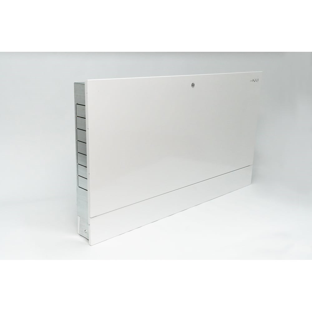 Шкаф распределительный торговой марки AXIS внутренний RV6 AXISRV6 ( на 12 выходов) предназначен для монтажа в них распределительных коллекторов для систем отопления, водоснабжения, насосно-смесительных узлов, малых тепловых пунктов и станций поквартирного учёта тепла и расхода воды. Шкаф распределительный внутренний (встраиваемый) серия AXISRV6 (12 выходов) предназначен для скрытого монтажа в стеновую нишу. Лицевые поверхности окрашены порошковой эмалью по фосфатной подготовке. Не окрашенные детали шкафов выполнены из оцинкованной стали. В боковых стенах корпуса выполнена перфорация, сегменты которой удаляются в месте, удобном для пропуска присоединительных трубопроводов. Выдвижная рама встраиваемых шкафов позволяет регулировать глубину. Диапазон регулировки - 60 мм. Регулировка шкафа по высоте до 63 мм осуществляется с помощью выдвижных ножек. Ножки имеют отверстия для крепления шкафа к полу. Откидная дверца имеет замок, закрывающий шкаф от несанкционированного доступа. Внутри шкафа установлены передвижные монтажные рейки, к которым крепится оборудование.