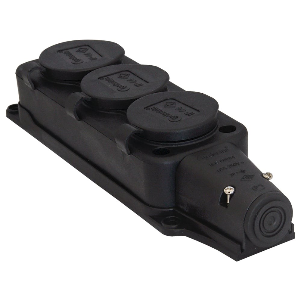 Колодка на 3 розетки TP Electric 16A 2P+E IP44 каучук. 3101-308-0300 изготовлена из влагостойкого и термостойкого каучука, имеет степень защиты IP44. Переноска имеет три каучуковых заглушки, которые предотвращают попадание воды, пыли и грязи к контактам изделия. Тройная розетка относится к категории электрозащитного оборудования, используется при максимальном токе 16 А.