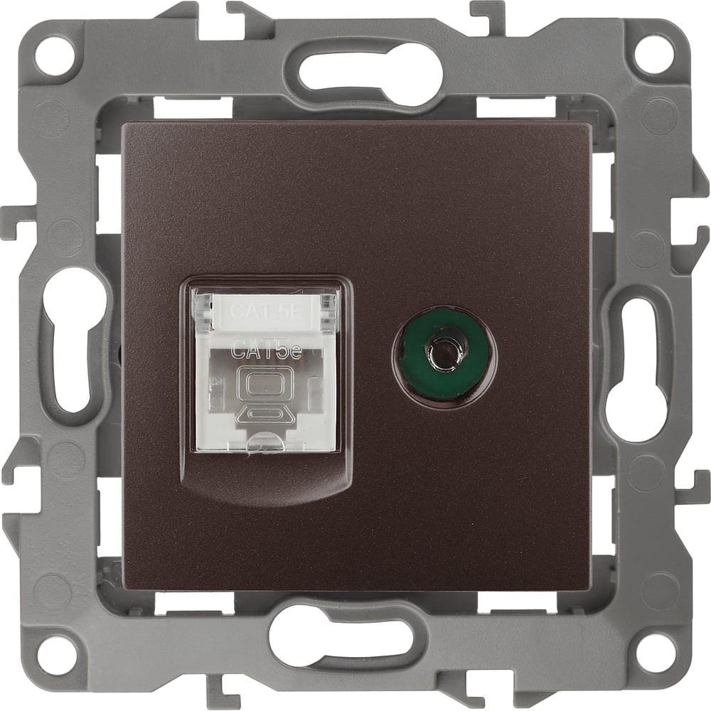 Комбинированная розетка ЭРА 12-3110-13 RJ45 TV, IP20, 12, бронза Б0027448 сделана из поликарбоната. Монтаж в подрозетник производится и на лапки, и на винты. Рамка приобретается отдельно.