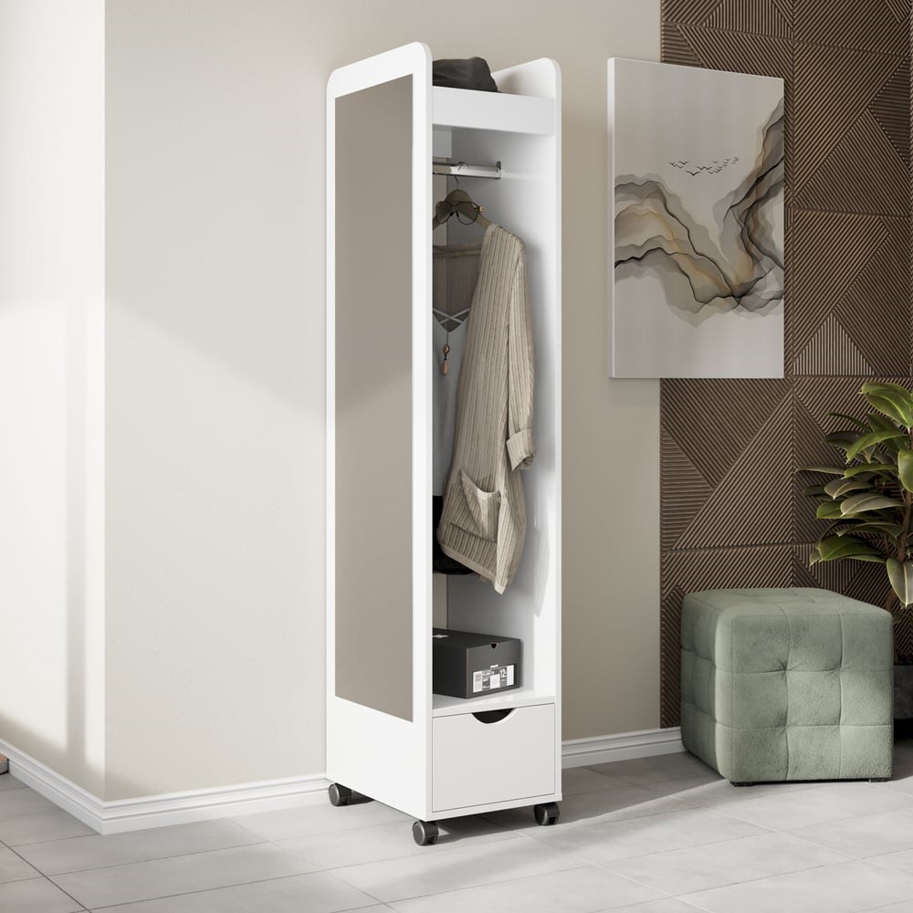 Вешалка напольная со штангой и ящиком для одежды изготовлена из экологичного материла - ЛДСП 16мм. Представлена в двух расцветках для возможности вписать в цвета любого интерьера. Вешалка напольная даст вам возможность хранить вещи в чистоте и порядке. Можно хранить такие вещи, как: офисная одежда, школьная форма, рубашки, юбки, брюки, верхняя одежда и др. На вешалке представлено зеркало для удобства примерки вещей перед выходом. Имеется дополнительный ящик хранения, штанга и поворотные колесики, с помощью которых вы сможете легко передвигать ее на нужное вам место. Устойчивая конструкция для вещей будет надежно удерживать любую одежду, выдерживает до 20 кг одежды. Все отверстия данной модели мебели сделаны на производстве, поставляется в разобранном виде, вся фурнитура и инструкция идет в комплекте. Вешалка напольная имеет быструю и легкую сборку.Прежде чем приступить к сборке, необходимо убедиться в качестве, количестве и соответствии всех деталей. Если таковые выявлены, необходимо незамедлительно связаться с площадкой и продавцом, для разрешения вопроса, не приступая к сборке. Товар после сборки возврату и обмену не подлежит.