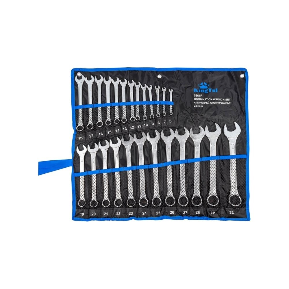 Ключи комбинированные, набор 25 предметов от бренда KINGTUL - ручной инструмент для работы с различными резьбовыми соединениями. Комбинированные гаечные ключи являются универсальными, так как совмещают в себе рожковый и накидной ключ одного размера. Накидная часть применяется для работы с тугими крепежными соединениями, а рожковая применятся, если нет возможности накинуть ключ на соединение сверху - в таком случае можно работать с какой-то из сторон рожковым гаечным ключом. Размеры проштампованы с обеих сторон каждого ключа, для облегчения идентификации. Материал изготовления: хромованадиевая сталь Cr-V. В комплект входит специальное полотно-чехол с кармашками под каждый ключ для удобства хранения и перемещения набора ключей. Кроме того, чехол снабжён люверсовыми подвесами для закрепления на стене. В наборе собраны наиболее ходовые размеры ключей. Размеры ключей: 6-28,30,32мм.