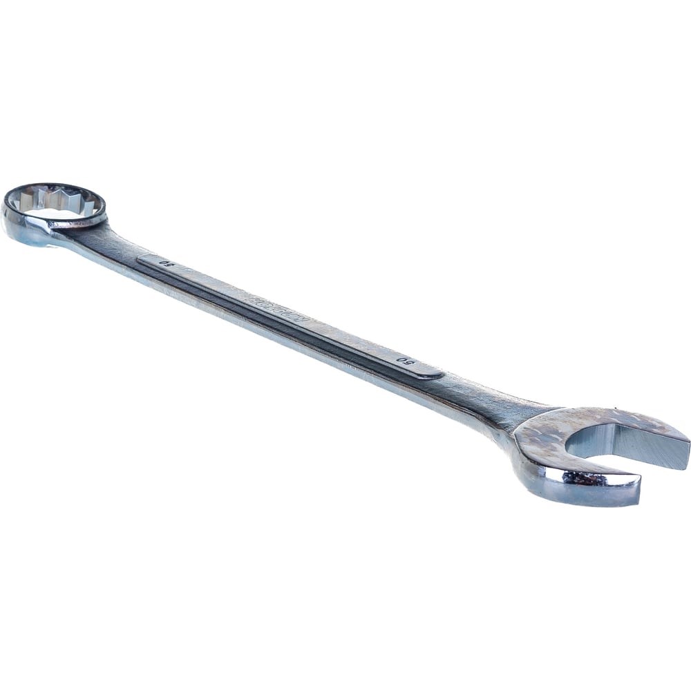 Ключ комбинированный Кратон50мм— высокопрочный инструмент для разъединения и соединения резьбовых деталей диаметром 5см. Инструмент с одной стороны имеет вид рожкового ключа, головка которого смещена на 15градусов от вертикали для обеспечения доступа в особо трудные места, на противоположной стороне размещен накидной ключ того же размера. Инструментальная сталь, с защитным антикоррозийным покрытием, исключает появление ржавчины, способствует длительной эксплуатации. Рекомендуется для профессионального использования.