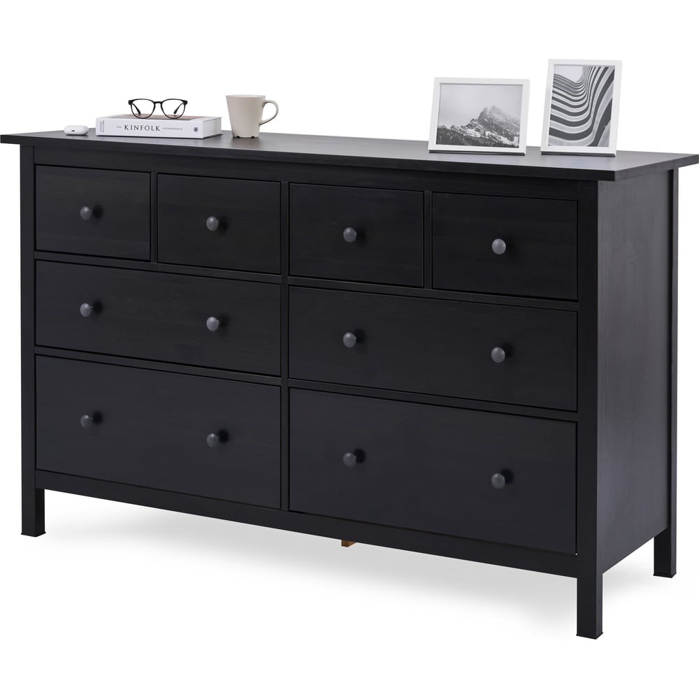 Комод КЫМОР с восемью ящиками станет отличным дополнением вашего интерьера. Этот комод прекрасно подойдет для хранения одежды, белья и других вещей, обеспечивая порядок и удобство в вашем доме. Комод выполнен из массива сосны, который ценится за свою прочность, долговечность и экологичность. Покрытие выполнено с использованием красителей на водной основе и лака на основе акриловых смол с УФ-отверждением. В комоде предусмотрено восемь ящиков на роликовых направляющих, которые изнутри не покрашены, как основная часть, что придает им естественный вид. Имеет высоту ножек 11 см, что облегчает уборку Максимальная нагрузка на верхние ящики - 15 кг. Максимальная нагрузка на средние и нижние ящики - 20 кг.