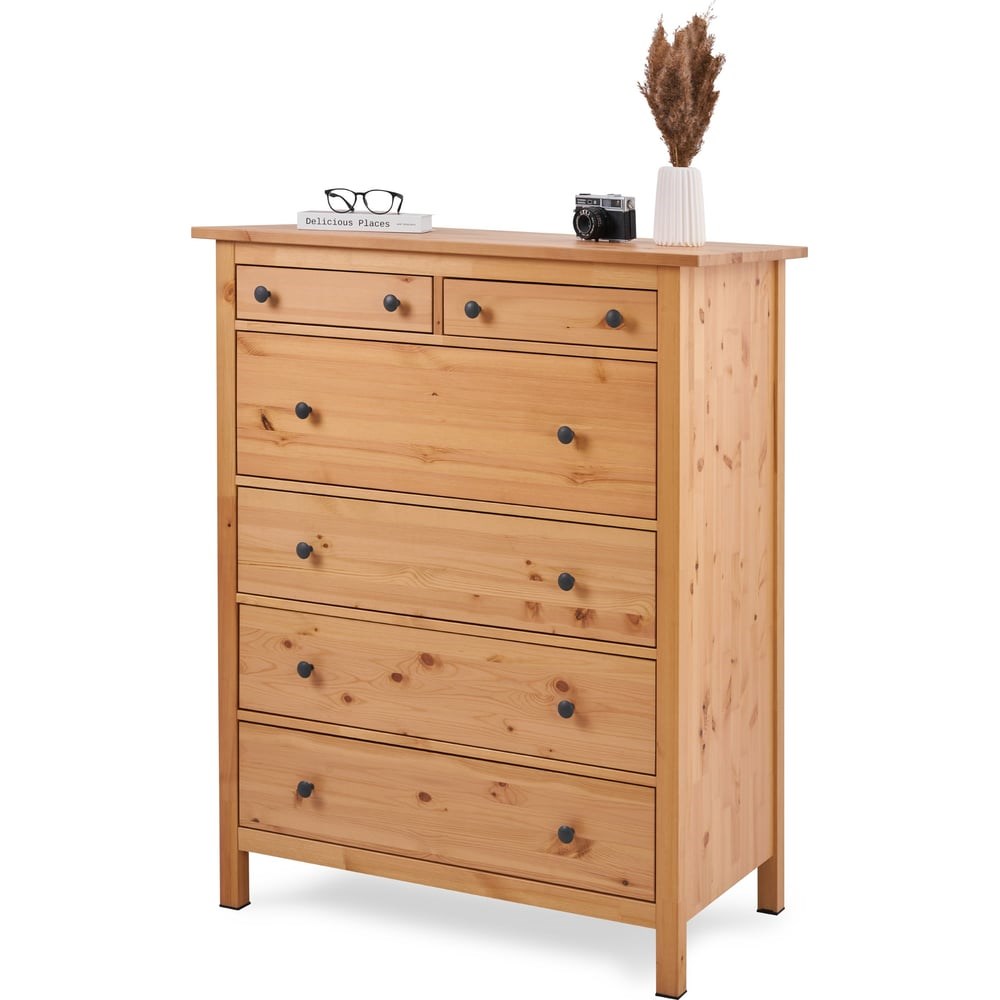 Комод КЫМОР с шестью ящиками станет отличным дополнением вашего интерьера. Этот комод прекрасно подойдет для хранения одежды, белья и других вещей, обеспечивая порядок и удобство в вашем доме. Комод выполнен из массива сосны, который ценится за свою прочность, долговечность и экологичность. Покрытие выполнено с использованием красителей на водной основе и лака на основе акриловых смол с УФ-отверждением. В комоде предусмотрено шесть ящиков на роликовых направляющих, которые изнутри не покрашены, как основная часть, что придает им естественный вид. Имеет высоту ножек 11 см, что облегчает уборку Максимальная нагрузка на верхние ящики - 10 кг. Максимальная нагрузка на средние и нижние ящики - 20 кг.