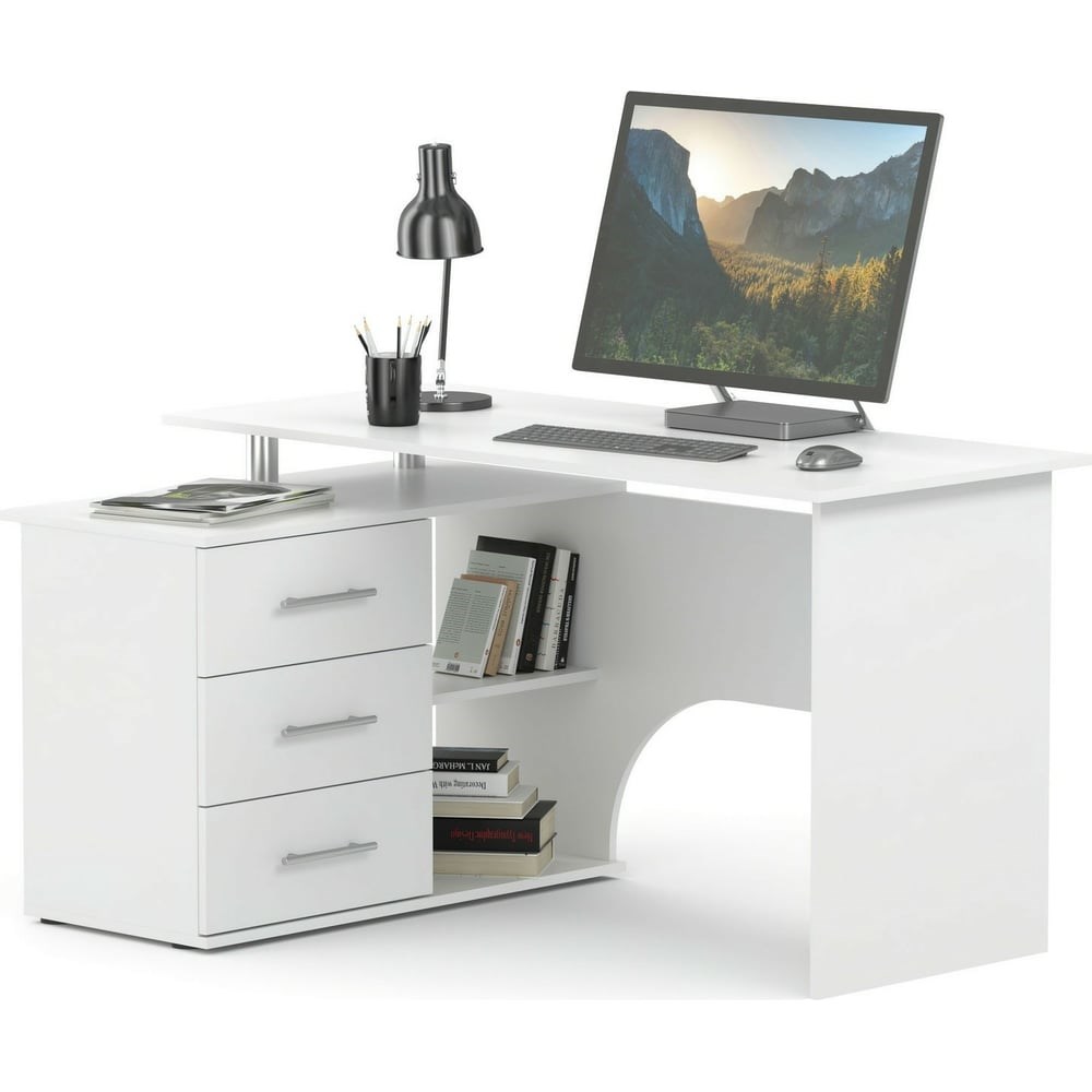 Компьютерный стол СОКОЛ левый белый КСТ-09 00-00010945 — идеальное решение для организации рабочего процесса как в домашнем кабинете, так и в офисной обстановке. Продуманная конструкция подразумевает две поверхности для размещения техники и подручных предметов, несколько открытых ниш и три выдвижных ящика для организации системы хранения книг, бумаг и канцелярских принадлежностей. Характеристики: Материал: ЛДСП 16 мм. Края обработаны кромкой ПВХ 0,4 и 2 мм. Тип направляющих: роликовые 350 мм. Максимальная нагрузка на столешницу, поверхность тумбы и нижнюю полку: 20 кг. Максимальная нагрузка на ящик и верхнюю полку: 5 кг. Ориентация сборки: левосторонняя (определяется по расположению тумбы).