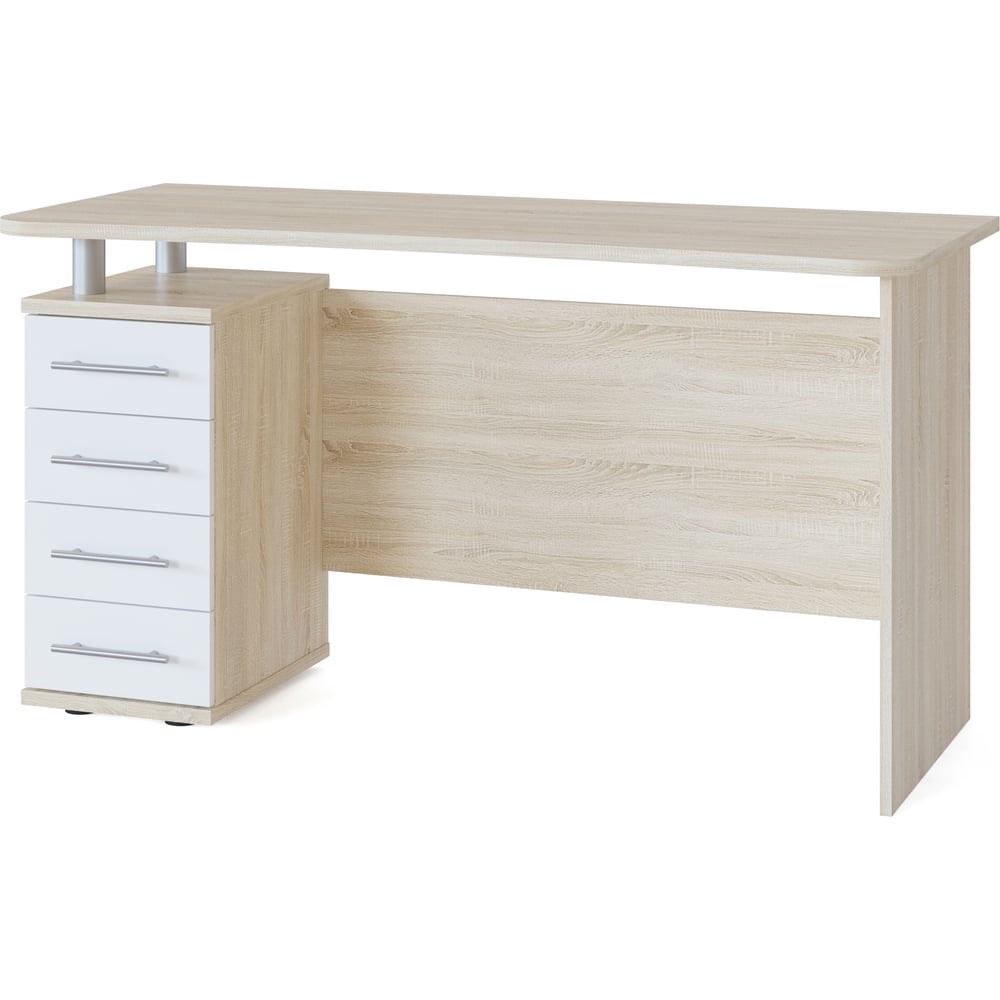 Компьютерный стол СОКОЛ КСТ-105 Дуб сонома/белый 00-00011412 представляет собой универсальную модель с тумбой на четыре выдвижных ящика. При сборке тумбу можно расположить как справа, так и слева. Благодаря широкой столешнице можно организовать полноценное и удобное рабочее место. Передний край столешницы имеет эргономичный изгиб, что делает работу за столом более комфортной. В середине ее глубина составляет 560 мм. Внутренний размер ящиков составляет 370х223 мм, что позволяет разместить в них документы формата А4 и канцелярские принадлежности. Столешница, крышка и основание тумбы изготовлены из ЛДСП толщиной 22 мм с кромкой ПВХ 2 мм. Остальные детали – ЛДСП 16 с кромкой ПВХ 0,4 мм. Ручки-рейлинги выполнены из металла, шириной 128 мм. Задняя стенка тумбы выполнена из ДВП серого цвета. Примите это во внимание, если собираетесь устанавливать стол не у стены.