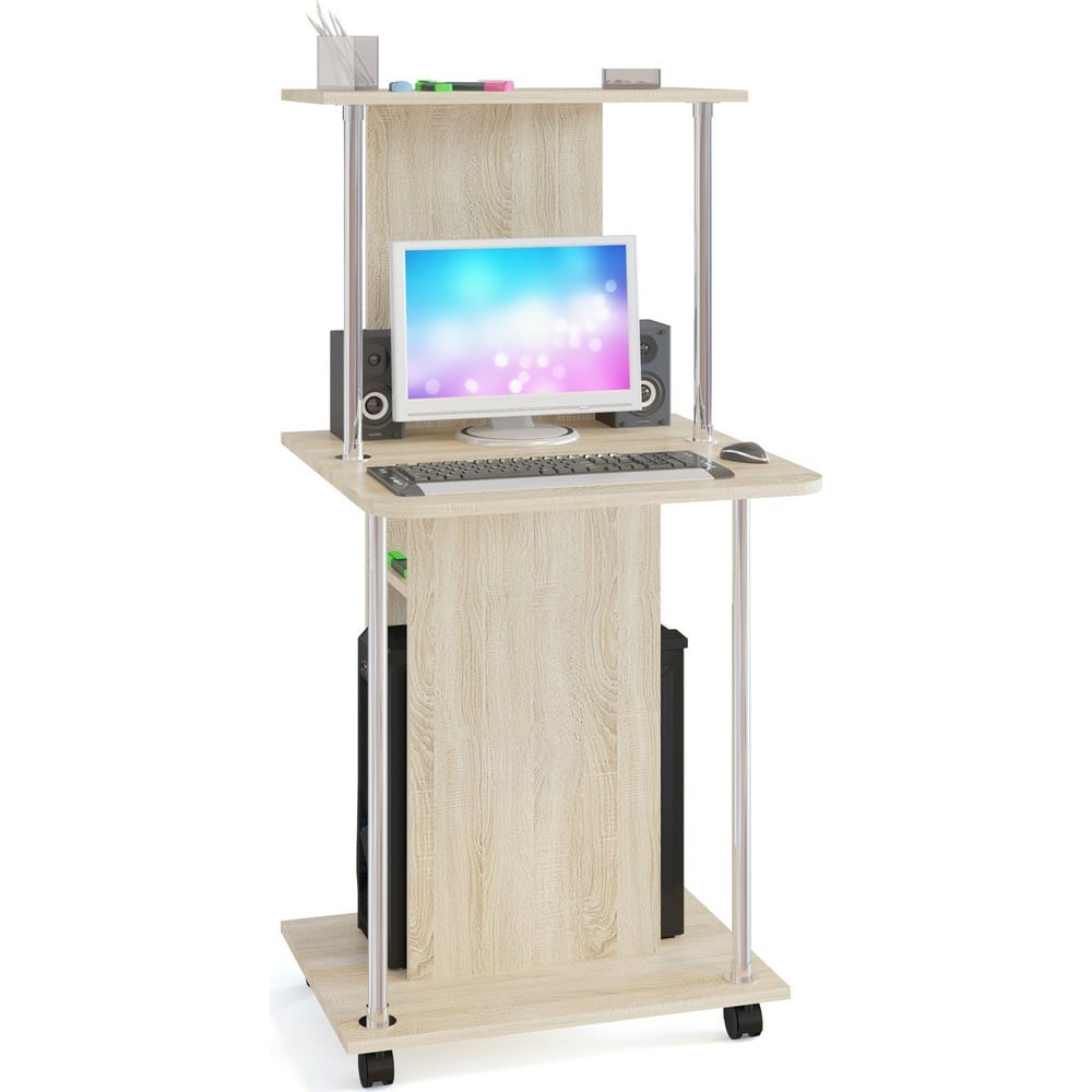 Компьютерный стол СОКОЛ дуб сонома КСТ-12 КСТ12Дс5 на колесиках. За таким столом Вы можете работать как с ноутбуком, так и за стационарным компьютером. За центральной стойкой предусмотрено место для системного блока. Высота от столешницы до верхней полочки — 476 мм. Высота от полочки над системным блоком до столешницы — 166 мм. Высота проема под системный блок — 500 мм, ширина проема — 238 мм. Проем под монитор позволяет разместить экран с диагональю до 20". Ширина столешницы между металлическими стойками составляет 498 мм. Изделие выполнено из ЛДСП толщиной 16 мм, края обработаны кромкой ПВХ 2 и 0,4 мм.