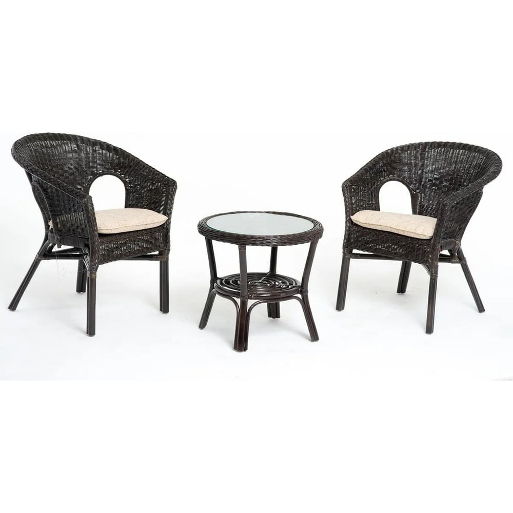 Комплект для отдыха Vinotti 2 кресла, стол 02/08 Темный Коньяк подходит для размещения в саду или на террасе. Надежность. Изготовлен из натурального ротанга, который отличается прочностью, долгим сроком службы, небольшим весом и экологичностью. Комплект отличается небольшими габаритами, благодаря чему подходит для размещения в ограниченном пространстве. Мягкие подушки придают дополнительную привлекательность, удобство и практичность в использовании.