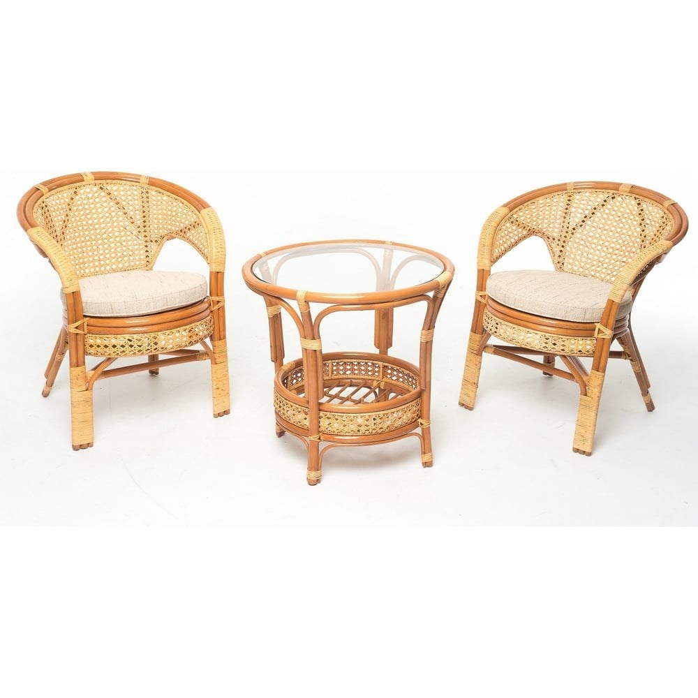 Комплект для отдыха Vinotti 2 кресла и стол 02/15 Коньяк подходит для размещения в саду или на террасе. Надежность. Изготовлен из натурального ротанга, который отличается прочностью, долгим сроком службы, небольшим весом и экологичностью. Комплект отличается небольшими габаритами, благодаря чему подходит для размещения в ограниченном пространстве. Мягкие подушки придают дополнительную привлекательность, удобство и практичность в использовании.