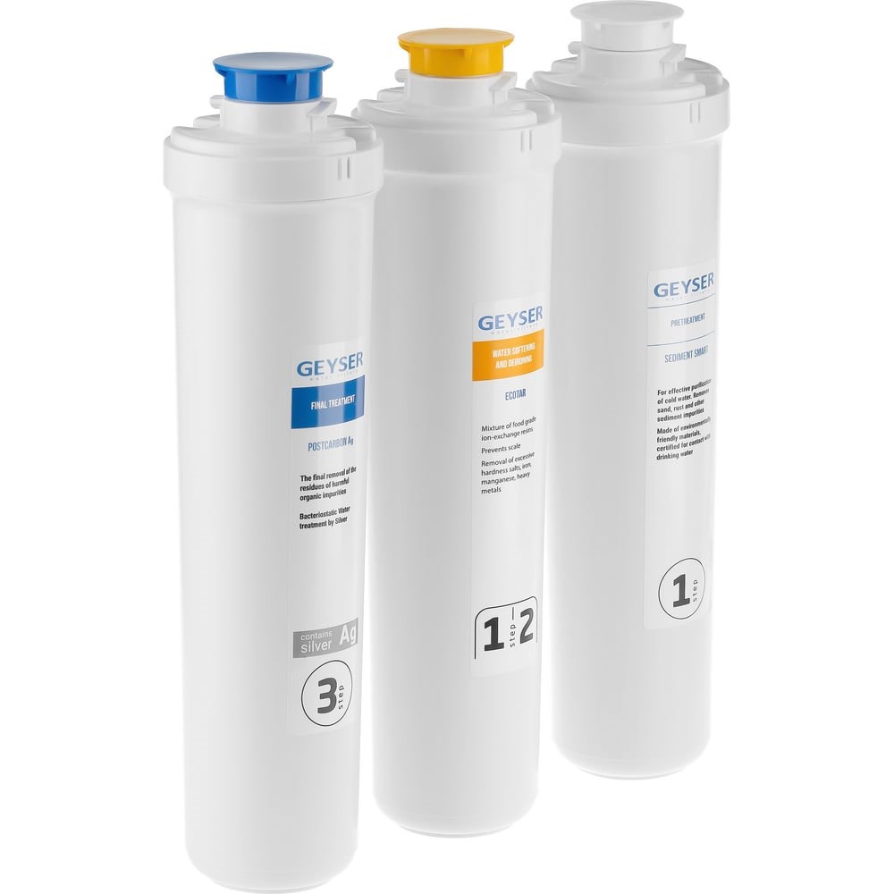 Комплект картриджей для Гейзер Оптима старт состоит из трёх картриджей: Механика Смарт - картридж содержит фильтрующий материал, изготовленный из вспененного полипропилена и предназначен для механической очистки воды от ржавчины, песка и других нерастворимых примесей. Экотар Смарт - картридж содержит смесь ионообменных смол пищевого класса для высокоэффективного удаления солей жесткости (накипи), повышенного содержания железа и марганца. Посткарбон Ag Смарт - картридж содержит высококачественный кокосовый уголь и материал Каталон, что позволяет удалить из воды остаточный хлор и хлорорганические примеси, доочистить железо и тяжелые металлы, улучшить вкус и цвет воды. Серебро в безопасной форме блокирует размножение бактерий. Срок службы картриджей: Механика Смарт – до 6 мес.; Экотар Смарт – до 2 мес.; Посткарбон Ag Смарт – до 12 мес.