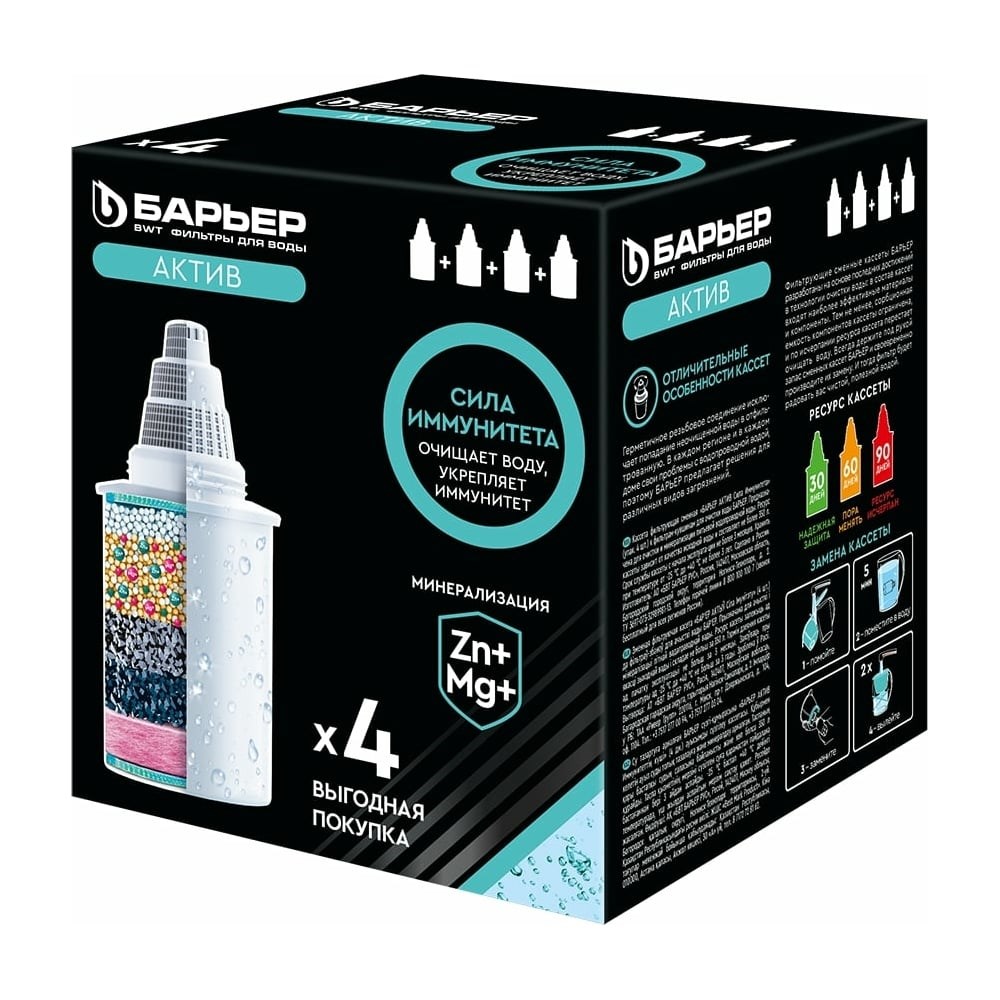Комплект кассет для кувшинов БАРЬЕР Актив Сила Иммунитета, 4 шт, обогащает магнием и цинком К494Р00 обогащает воду цинком и магнием. Цинк положительно влияет на иммунитет. Магний – природный антистресс. Удаляет из воды хлор и другие вредные примеси, защищает от накипи, улучшает вкус воды. Ресурс 350 литров