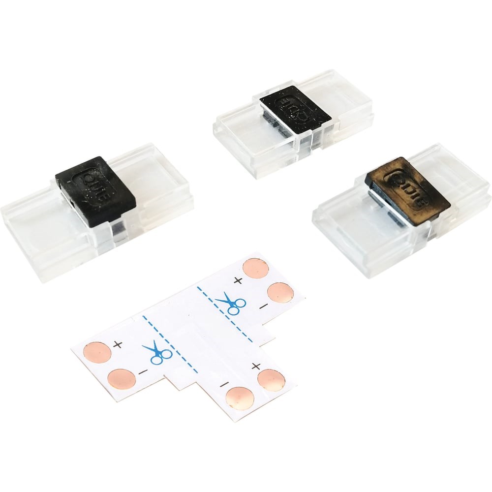 Набор коннекторов 09-64 для светодиодной ленты служит прекрасной альтернативой в тех случаях, когда нет возможности паять. Зажимы из комплекта отличаются от стандартных тем, что они прокалывают подложку светодиодной ленты, чем достигается более надежный контакт. Кроме этого они являются универсальными и хорошо подходят к светодиодной ленте с шириной подложки 8 мм и 10 мм. Тип диодов светодиодной ленты - 2835, 3528, 5630, 5050.С помощью коннектора можно сделать Г-образное или Т-образное соединение.