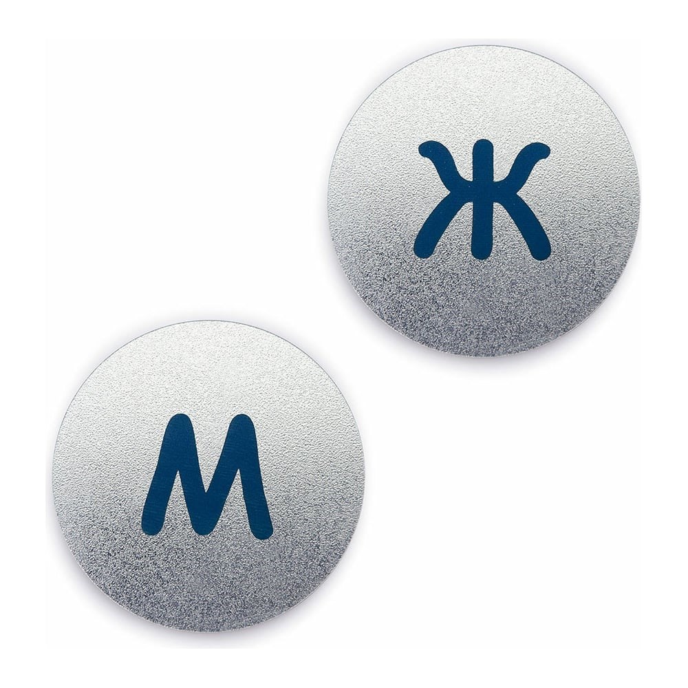 Комплект круглых табличек GRM Туалет К121 и К122, 2 шт., диаметр 83 мм х 1.5 мм 218000331 - дверные информационные таблички для туалета «М» и «Ж». Выполнены из пластика методом лазерной гравировки. Крепление на двухсторонний скотч (входит в комплект). Дополнительные характеристики: Цвета: серебряный/тёмно-синий; Материал: двухслойный пластик для гравировки.