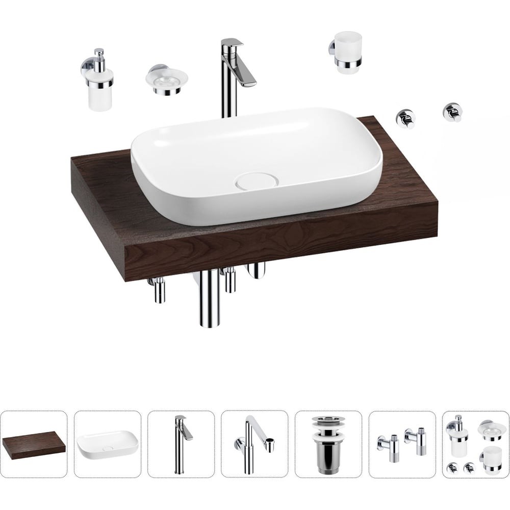 Комплексное предложение по специальной цене от Wellsee. СТОЛЕШНИЦА Основа столешницы из дерева Genuine Tree – высококачественная импрегнированная плита МДФ, пропитанная специальным составом для усиления стойкости материала и максимальной защиты от влаги, перепадов температур, грибка и плесени. Максимальная влагостойкость достигается за счет укрепления торцов изделия массивом дерева. Далее поверхность столешницы покрывается натуральным шпоном и дополнительно обрабатывается бейцем, что позволяет получать уникальную для каждого покупателя текстуру и выразительный цвет. РАКОВИНА Тонкостенная накладная раковина Wellsee Croquis станет лаконичным завершающим штрихом интерьерного пространства ванной комнаты. Наличие керамического клапана на слив деликатно подчеркнет эстетику умывальной зоны, а элегантный белый цвет добавит света и воздушности внутренней отделке санузла. СМЕСИТЕЛЬ Надежный латунный смеситель с испанским картриджем 35 мм обеспечивает высокую точность управления напором и температурой воды, благодаря которому наслаждаться плавным скольжением ручки и мягким ходом смесителя можно более 10 лет. Регулируемый аэратор Neoperl с технологией AIRflow² позволяет скорректировать направление потока, уменьшает разбрызгивание и приглушает шум воды. ВАННАЯ КОМНАТА В СТИЛЕ WELLSEE Завершить современный интерьер ванной комнаты можно с помощью сифона, донного клапана, угловых вентилей (2 шт), набора аксессуаров (5 шт) и элегантными зеркалами 7 Rays' Spectrum.