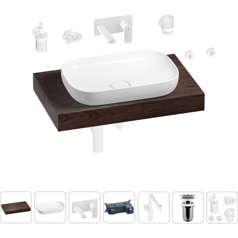Комплексное предложение по специальной цене от Wellsee. СТОЛЕШНИЦА Основа столешницы из дерева Genuine Tree – высококачественная импрегнированная плита МДФ, пропитанная специальным составом для усиления стойкости материала и максимальной защиты от влаги, перепадов температур, грибка и плесени. Максимальная влагостойкость достигается за счет укрепления торцов изделия массивом дерева. Далее поверхность столешницы покрывается натуральным шпоном и дополнительно обрабатывается бейцем, что позволяет получать уникальную для каждого покупателя текстуру и выразительный цвет. РАКОВИНА Тонкостенная накладная раковина Wellsee Croquis станет лаконичным завершающим штрихом интерьерного пространства ванной комнаты. Наличие керамического клапана на слив деликатно подчеркнет эстетику умывальной зоны, а элегантный белый цвет добавит света и воздушности внутренней отделке санузла. СМЕСИТЕЛЬ Надежный латунный смеситель с испанским картриджем 35 мм обеспечивает высокую точность управления напором и температурой воды, благодаря которому наслаждаться плавным скольжением ручки и мягким ходом смесителя можно более 10 лет. Регулируемый аэратор Neoperl с технологией AIRflow² позволяет скорректировать направление потока, уменьшает разбрызгивание и приглушает шум воды. ВАННАЯ КОМНАТА В СТИЛЕ WELLSEE Завершить современный интерьер ванной комнаты можно с помощью сифона, донного клапана, угловых вентилей (2 шт), набора аксессуаров (5 шт) и элегантными зеркалами 7 Rays' Spectrum.