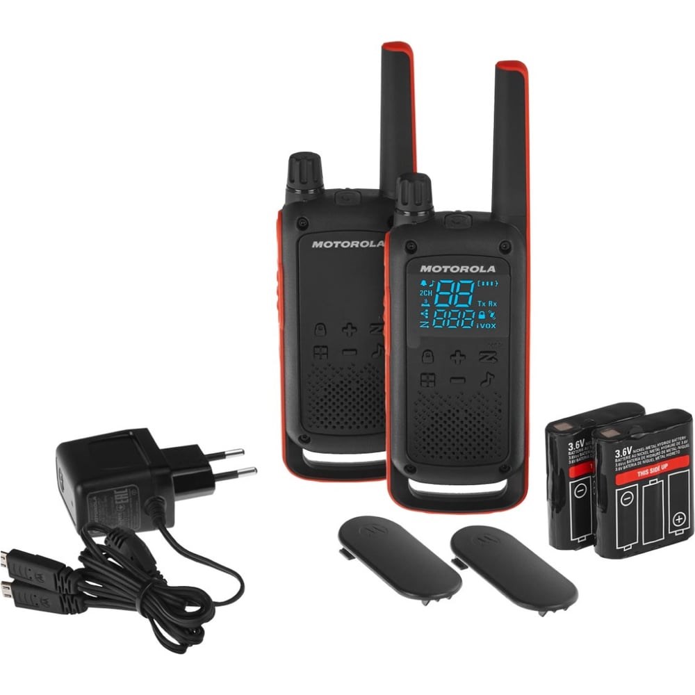 Комплект из двух радиостанций Motorola T82 TALKABOUT B8P00811EDRMAW представляет собой новое поколение безлицензионных радиостанции PMR446.Изделия имеют практичное матовое покрытие, обладающее защищенностью от брызг.К преимуществам модели можно отнести понятное управление, быстрое сопряжение, скрытый дисплей, наличие аварийной кнопки.Особенности:безлицензионный диапазон PMR446дальность действия до 10 км*16 каналов** +121 кодфункция легкого сопряжения раций в группеiVOX/VOXскрытый дисплей с подсветкойкласс защиты IPX2сканирование/мониторинг каналовсветодиодный фонарик* диапазон может изменяться в зависимости от окружающих и/или топографических условий.** в Российской Федерации согласно закону допускается использование только 8 каналов.