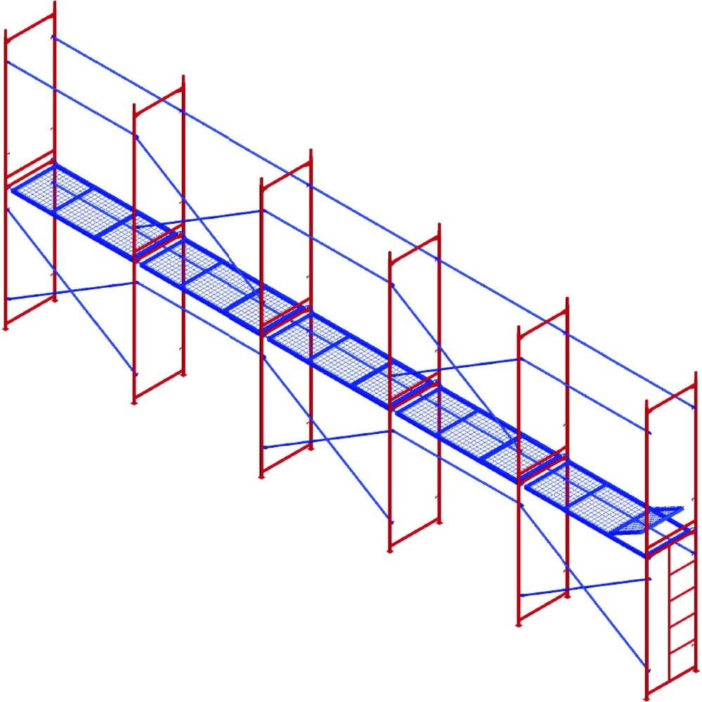 Комплект рамных лесов МЕГА М 4х10 774 используют при отделочных, ремонтных и строительных работах на фасаде зданий. Опорные пяты принимают на себя нагрузку всей конструкции и устанавливаются на ровные деревянные подкладки. Крепление лесов к стене осуществляется анкерными кронштейнами с регулировкой. Рамы связываются между собой до нужной высоты и ширины с помощью диагональных связей в шахматном порядке со стороны улицы и горизонтальных - со стороны стены. Металлические настилы с отверстиями предотвращают скольжение в процессе работы. Рама с лестницей служит для подъема рабочих и всегда располагается в нижнем ряду лесов. На предохранительном и рабочем ярусах прикрепляются продольные ограждения.