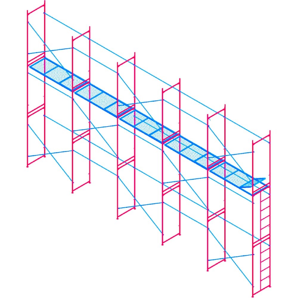 Комплект рамных лесов МЕГА М 6х10 779 используют при отделочных, ремонтных и строительных работах снаружи помещений. Опорные пяты принимают на себя нагрузку всей конструкции и устанавливаются на ровную деревянную поверхность. Крепление лесов к стене осуществляется при помощи анкерных кронштейнов с регулировкой. Рамы соединяются между собой до нужной высоты и ширины диагональными связями в шахматном порядке со стороны улицы и горизонтальными - со стороны стены. Металлические настилы с отверстиями предотвращают скольжение в процессе работы. Рамы с лестницей служат для подъема и находятся друг над другом для максимального удобства. На предохранительном и рабочем ярусах размещаются продольные ограждения.