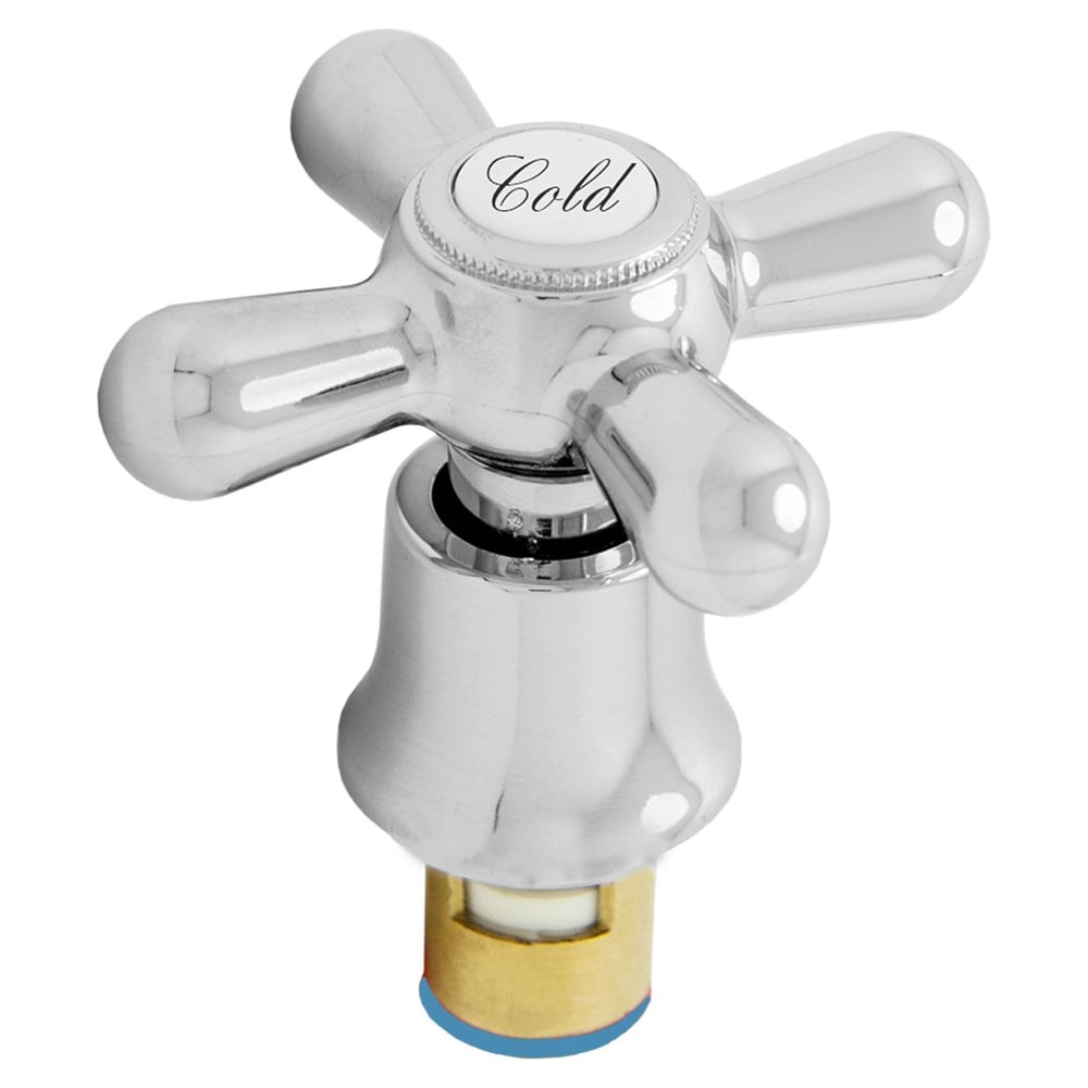 Комплект из кран-буксы с металлокерамическими запорными пластинами в латунном корпусе, установочной резьбой 1/2", углом поворота 180 и пластикового маховика крестообразной формы с юбкой.