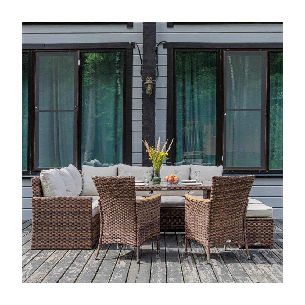 Комплектация и габариты:Диван прямой - 171x71x81 смДиван угловой- 183x71x81 смКресло(2 шт.) - 60х59х87 смОбеденный стол - 150x90x70 смПуф (2 шт.) - 40x40x33 смМатериалы:Материал комплекта - искусственный ротанг (ручного плетения)Материал каркаса – сталь, окрашенная порошковым методомМатериал столешницы - закаленное стеклоМатериал подлокотников кресла - поливуд (искуссвенное дерево)Материал чехла на подушки - олефин (водоотталкивающая ткань)Материал наполнителя подушек под спину - синтетический пухМатериал наполнителя подушек для сидения - поролонЦвет комплекта - КоричневыйЦвет подушек - БежевыйДополнительная информация:Количество посадочных мест – 9-11 человекМаксимальная нагрузка на посадочное место - 150 кгЧехлы съемные - даТемпературный режим - от -50C до +50CСочетается с комплектами бренда ROYAL FAMILY - ZOYA, KARL, GRAND VICKY, FIONA, VIOLETTA в коричневом цветеНакладки на ножки - да (пластиковые)Категория ротанга - первичнаяДержатели и крепления подушек зависят от поставки и не являются неотъемлемой частью комплекта