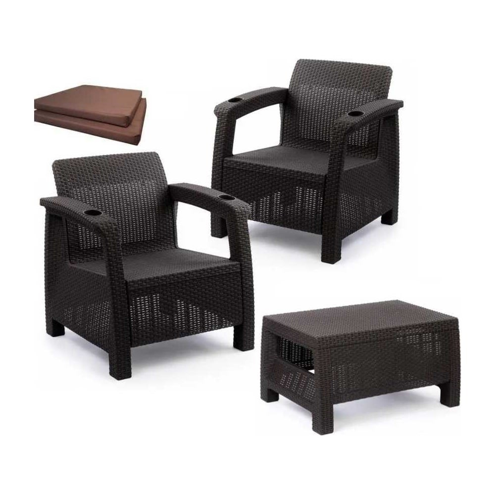 Материал мебели: полипропилен Цвет мебели: мокко Материал подушек: ткань Оксфорд D600 коричневого цвета Наполнитель подушек: поролон, подушка с замком Толщина подушки сиденья: 5 см Допустимая нагрузка – 120 кг Мебель поставляется в коробках в разобранном виде